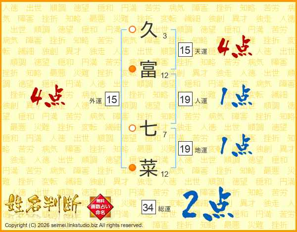 生活面を象徴する運勢です。外部から受ける影響力を表し、結婚運、家庭運や職場、環境への順応性を表します。総運から人運を引いた画数。姓や名が1文字の場合を除く。