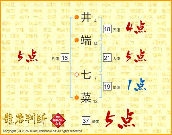 生活面を象徴する運勢です。外部から受ける影響力を表し、結婚運、家庭運や職場、環境への順応性を表します。総運から人運を引いた画数。姓や名が1文字の場合を除く。