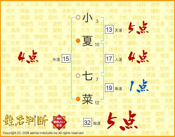 生活面を象徴する運勢です。外部から受ける影響力を表し、結婚運、家庭運や職場、環境への順応性を表します。総運から人運を引いた画数。姓や名が1文字の場合を除く。