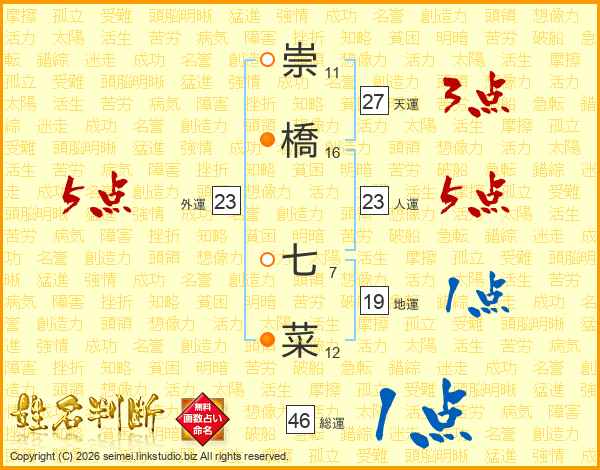 崇(11画)橋(16画) 七(7画)菜(12画)