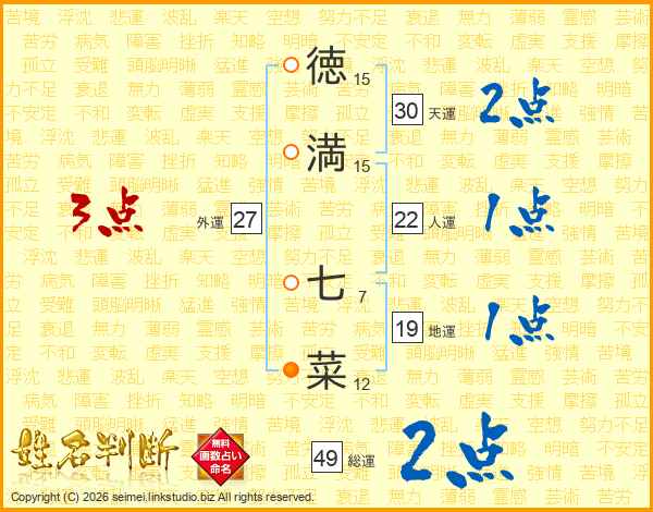 生活面を象徴する運勢です。外部から受ける影響力を表し、結婚運、家庭運や職場、環境への順応性を表します。総運から人運を引いた画数。姓や名が1文字の場合を除く。