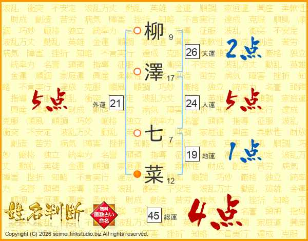 柳(9画)澤(17画) 七(7画)菜(12画)