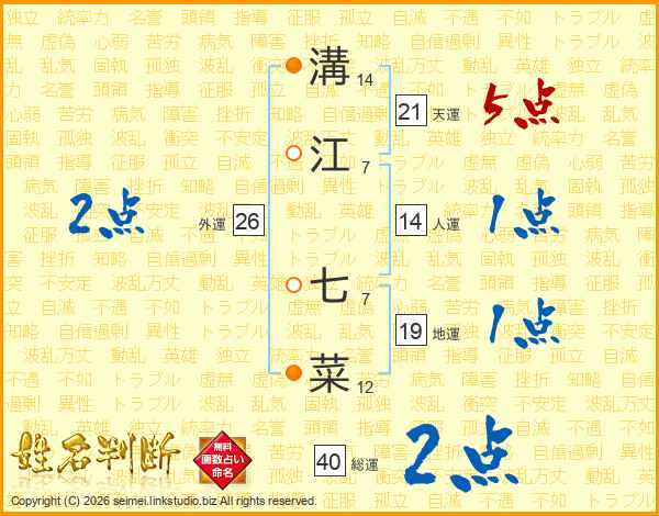 生活面を象徴する運勢です。外部から受ける影響力を表し、結婚運、家庭運や職場、環境への順応性を表します。総運から人運を引いた画数。姓や名が1文字の場合を除く。