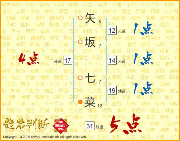矢坂七菜さんの総運は31画の5点!