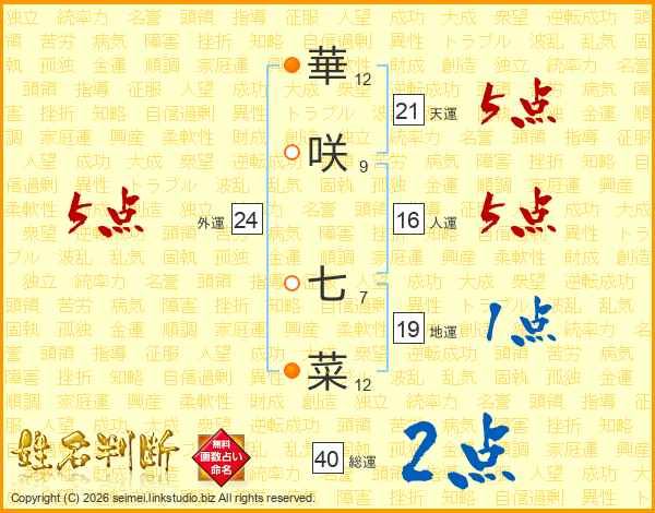 生活面を象徴する運勢です。外部から受ける影響力を表し、結婚運、家庭運や職場、環境への順応性を表します。総運から人運を引いた画数。姓や名が1文字の場合を除く。