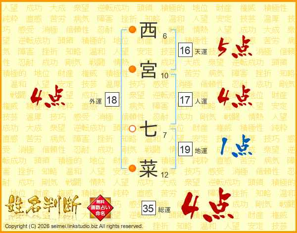 生活面を象徴する運勢です。外部から受ける影響力を表し、結婚運、家庭運や職場、環境への順応性を表します。総運から人運を引いた画数。姓や名が1文字の場合を除く。