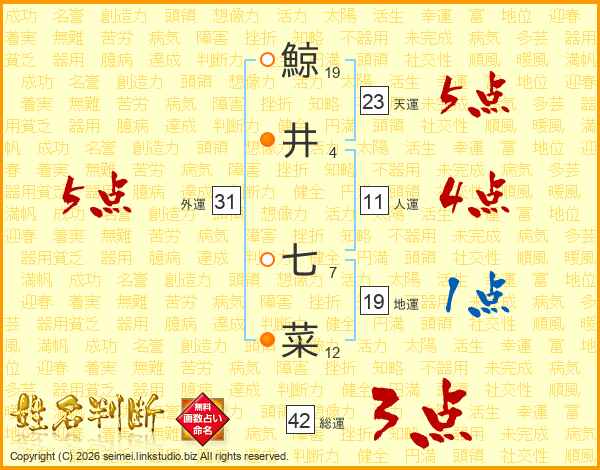 鯨(19画)井(4画) 七(7画)菜(12画)