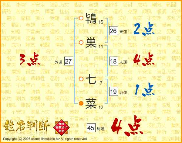 鴇(15画)巣(11画) 七(7画)菜(12画)