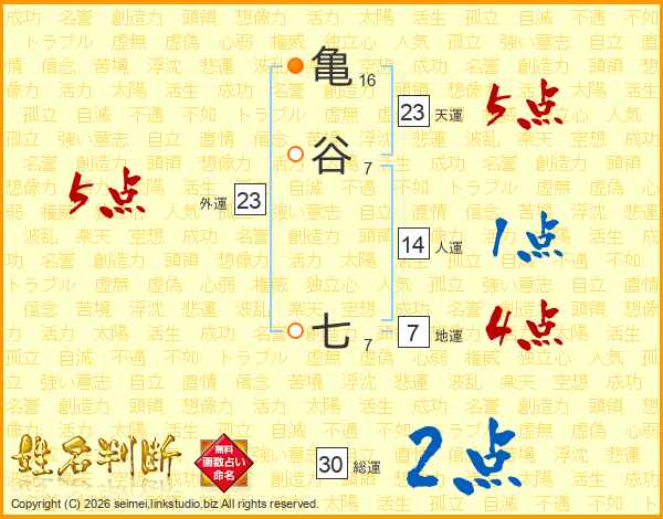 亀谷七さんの天運は23画の5点!