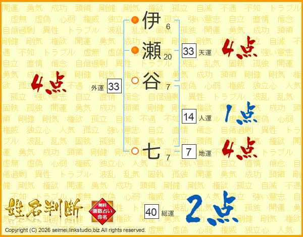 伊(6画)瀬(20画)谷(7画) 七(7画)