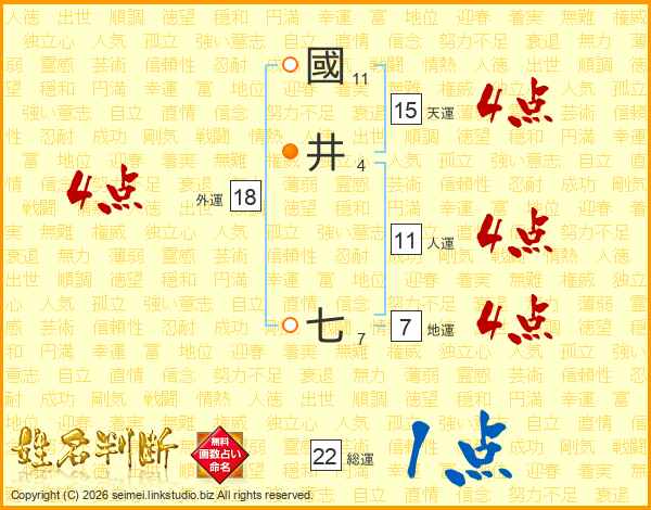 生活面を象徴する運勢です。外部から受ける影響力を表し、結婚運、家庭運や職場、環境への順応性を表します。総運から人運を引いた画数。姓や名が1文字の場合を除く。
