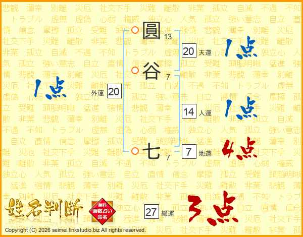 生活面を象徴する運勢です。外部から受ける影響力を表し、結婚運、家庭運や職場、環境への順応性を表します。総運から人運を引いた画数。姓や名が1文字の場合を除く。