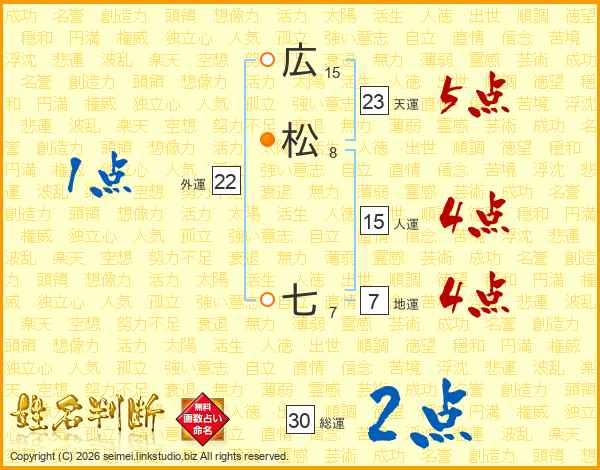 生活面を象徴する運勢です。外部から受ける影響力を表し、結婚運、家庭運や職場、環境への順応性を表します。総運から人運を引いた画数。姓や名が1文字の場合を除く。