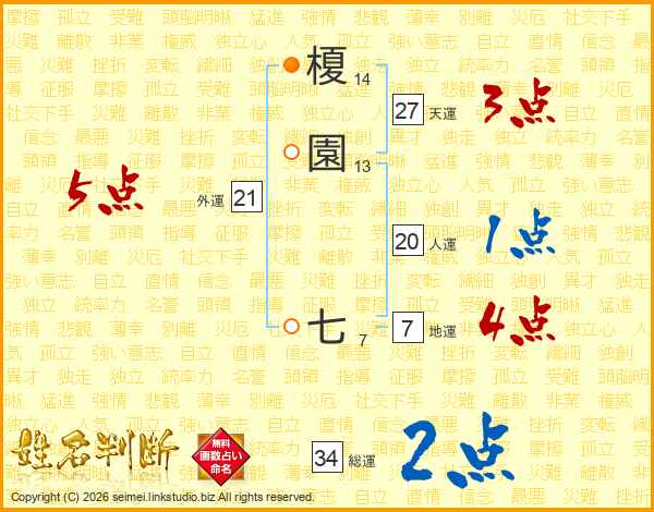 生活面を象徴する運勢です。外部から受ける影響力を表し、結婚運、家庭運や職場、環境への順応性を表します。総運から人運を引いた画数。姓や名が1文字の場合を除く。