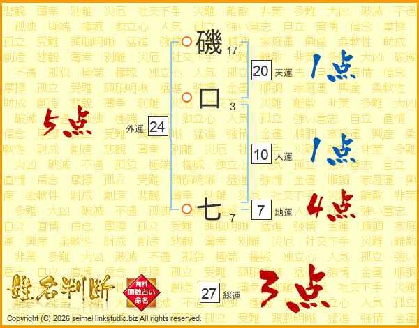 生活面を象徴する運勢です。外部から受ける影響力を表し、結婚運、家庭運や職場、環境への順応性を表します。総運から人運を引いた画数。姓や名が1文字の場合を除く。