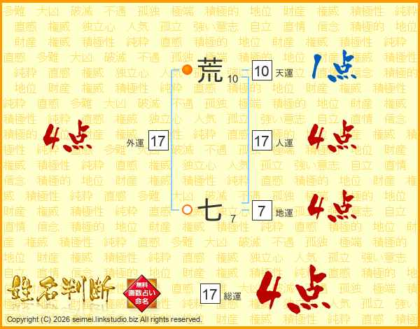 生活面を象徴する運勢です。外部から受ける影響力を表し、結婚運、家庭運や職場、環境への順応性を表します。総運から人運を引いた画数。姓や名が1文字の場合を除く。