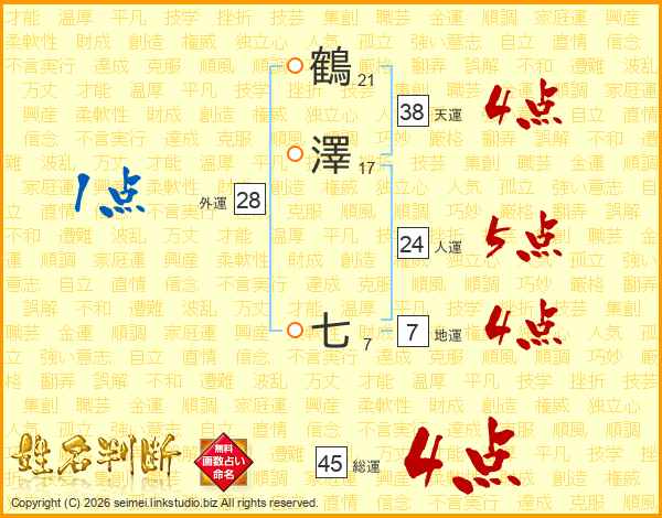 鶴澤七さんの総運は45画の4点!