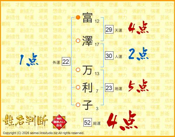 富(12画)澤(17画) 万(13画)利(7画)子(3画)