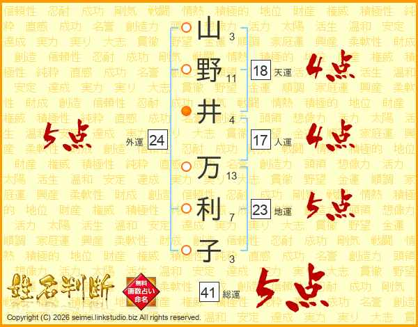 山(3画)野(11画)井(4画) 万(13画)利(7画)子(3画)