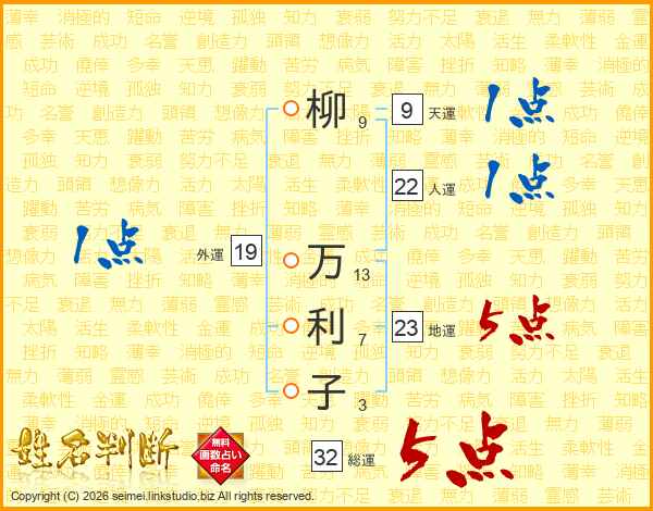 生活面を象徴する運勢です。外部から受ける影響力を表し、結婚運、家庭運や職場、環境への順応性を表します。総運から人運を引いた画数。姓や名が1文字の場合を除く。