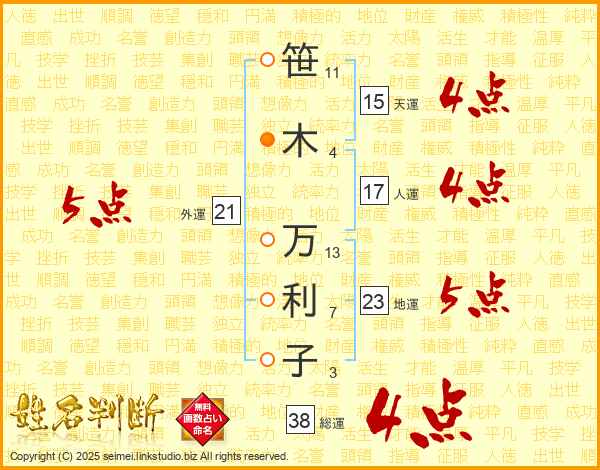 笹(11画)木(4画) 万(13画)利(7画)子(3画)