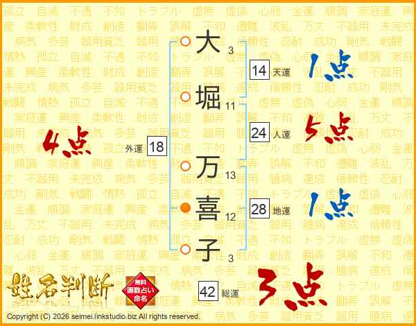 大(3画)堀(11画) 万(13画)喜(12画)子(3画)