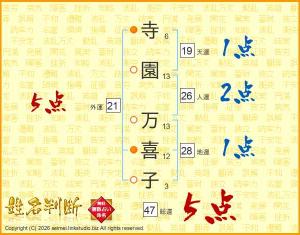 寺(6画)園(13画) 万(13画)喜(12画)子(3画)