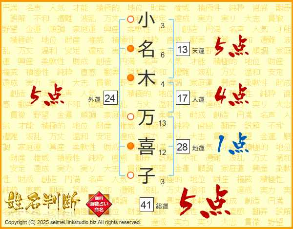 小(3画)名(6画)木(4画) 万(13画)喜(12画)子(3画)