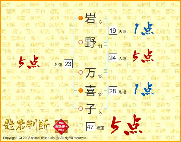 岩(8画)野(11画) 万(13画)喜(12画)子(3画)