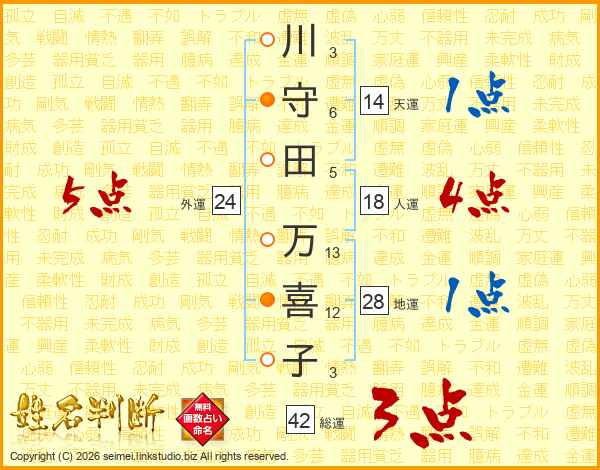 川(3画)守(6画)田(5画) 万(13画)喜(12画)子(3画)