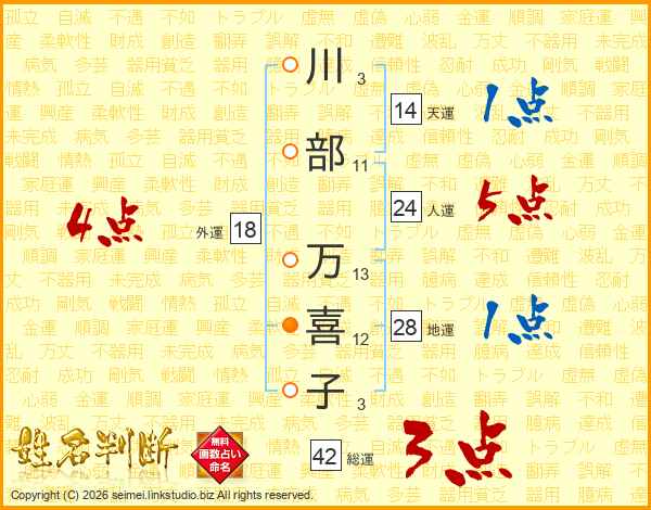 川(3画)部(11画) 万(13画)喜(12画)子(3画)