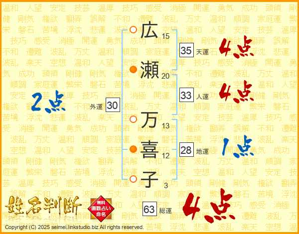 広(15画)瀬(20画) 万(13画)喜(12画)子(3画)