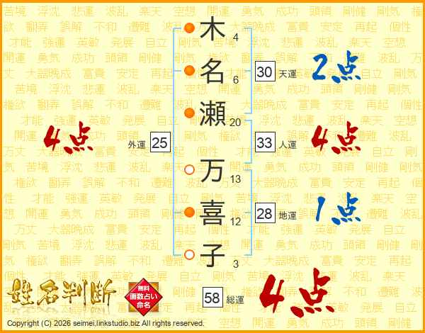 木(4画)名(6画)瀬(20画) 万(13画)喜(12画)子(3画)