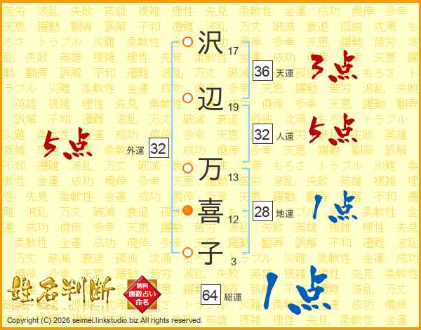 沢(17画)辺(19画) 万(13画)喜(12画)子(3画)