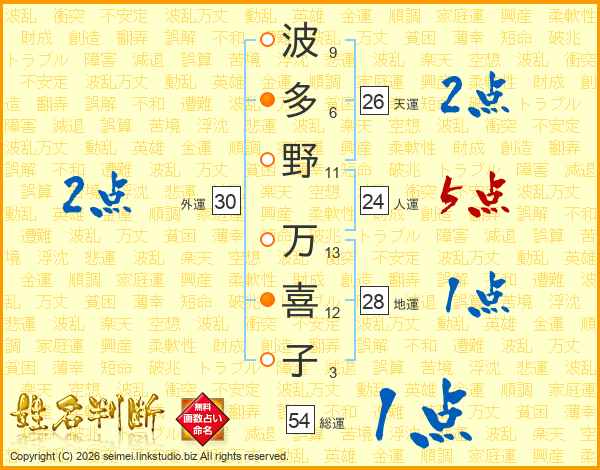 波(9画)多(6画)野(11画) 万(13画)喜(12画)子(3画)