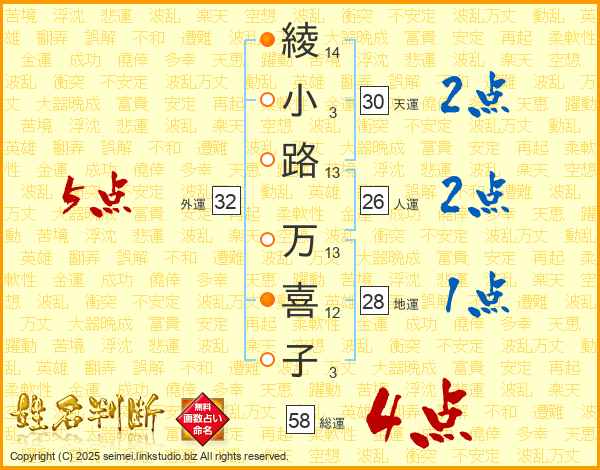 綾(14画)小(3画)路(13画) 万(13画)喜(12画)子(3画)