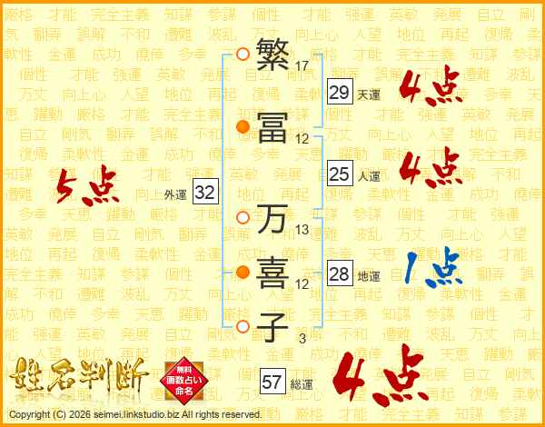 繁冨万喜子さんの天運は29画の4点!