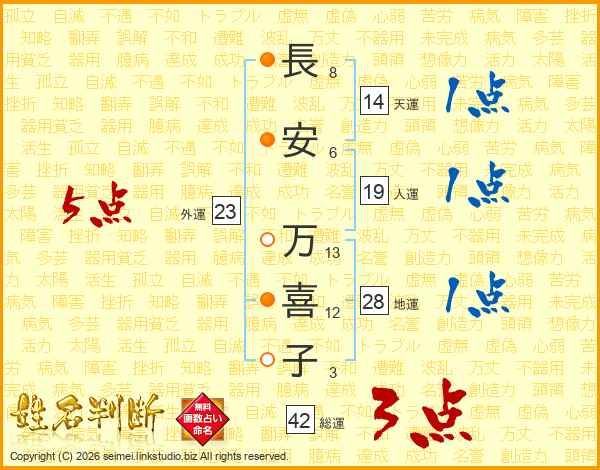 長(8画)安(6画) 万(13画)喜(12画)子(3画)