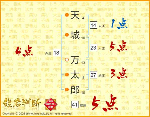 天(4画)城(10画) 万(13画)太(4画)郎(10画)