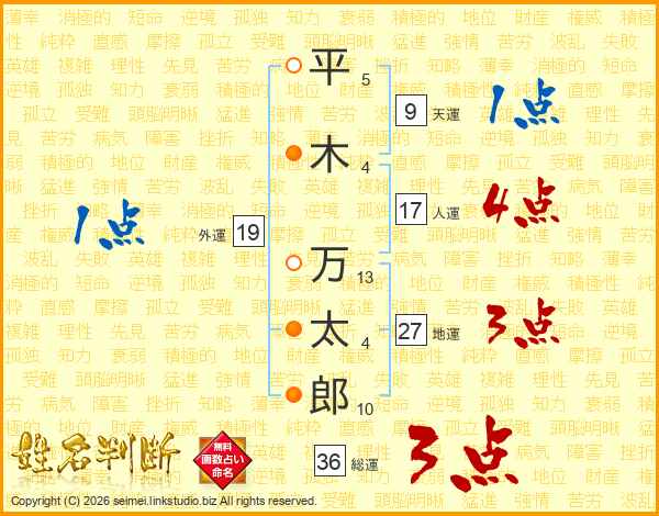 平(5画)木(4画) 万(13画)太(4画)郎(10画)