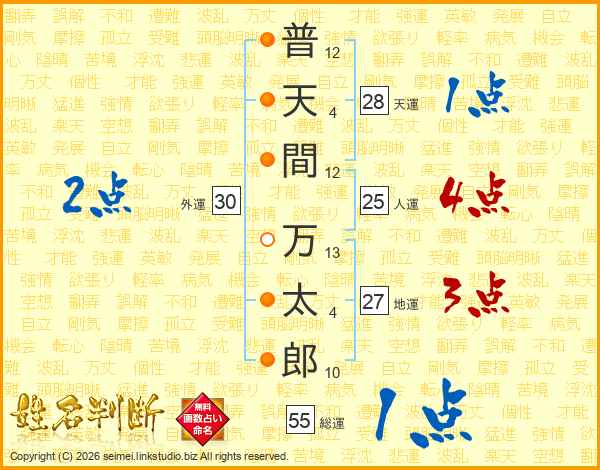 普(12画)天(4画)間(12画) 万(13画)太(4画)郎(10画)