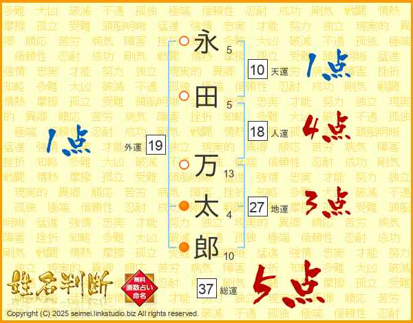 永(5画)田(5画) 万(13画)太(4画)郎(10画)