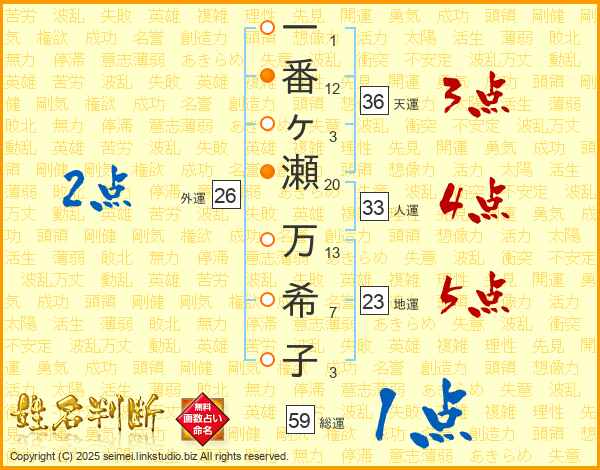 一(1画)番(12画)ヶ(3画)瀬(20画) 万(13画)希(7画)子(3画)