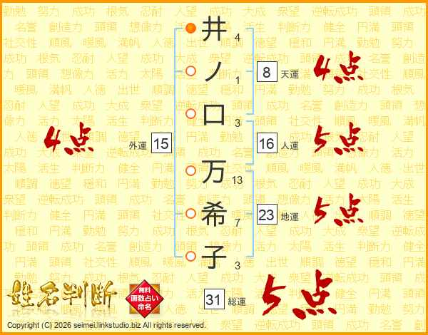 井(4画)ノ(1画)口(3画) 万(13画)希(7画)子(3画)