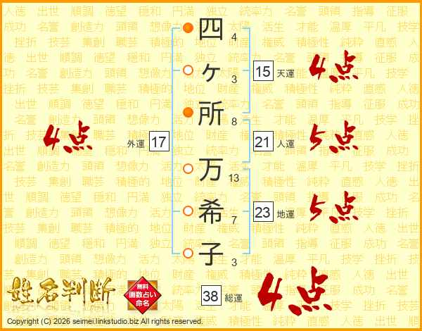 四(4画)ヶ(3画)所(8画) 万(13画)希(7画)子(3画)