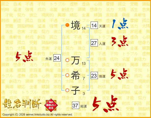 境(14画) 万(13画)希(7画)子(3画)