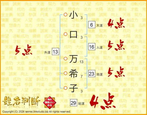 小(3画)口(3画) 万(13画)希(7画)子(3画)