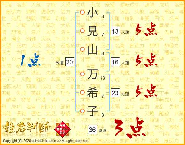 小(3画)見(7画)山(3画) 万(13画)希(7画)子(3画)