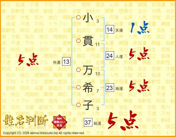 小(3画)貫(11画) 万(13画)希(7画)子(3画)