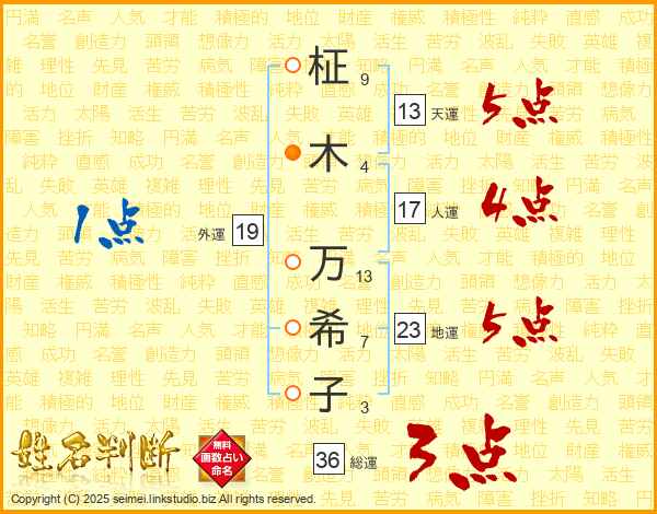 柾(9画)木(4画)  万(13画)希(7画)子(3画)